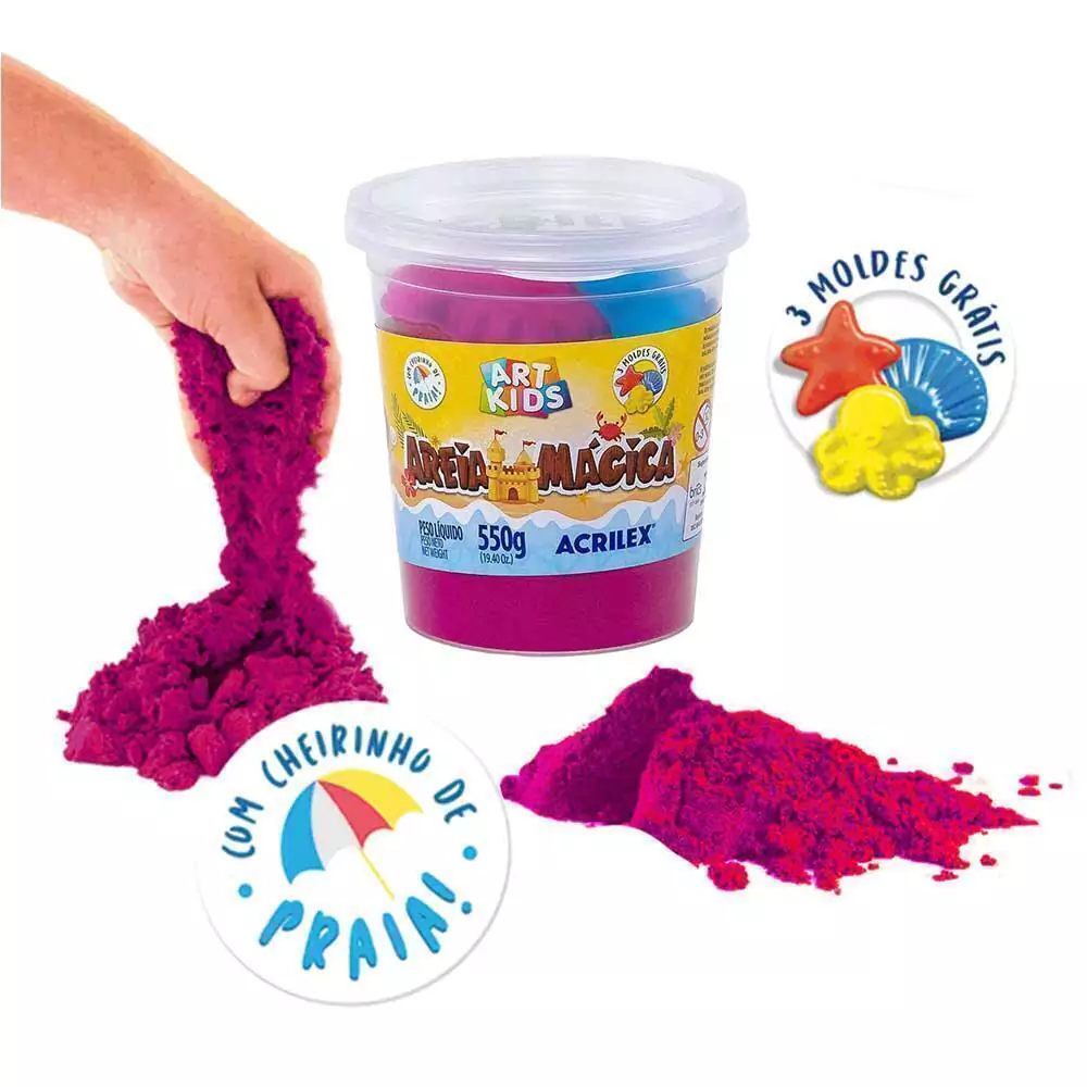 A Areia Mágica 550g Art Kids Acrilex proporciona as crianças, uma incrível experiência sensorial, desenvolve a coordenação motora, habilidades manuais e a criatividade. Vem com 1 forminhas com tema praia para modelar. Diverte e desenvolve a criatividade brincando.