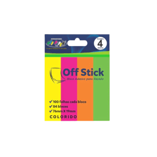 Os blocos adesivos Off Paper têm 76mm x 19mm e vêm em quatro cores diferentes: amarelo, verde, laranja e rosa. Cada bloco tem 100 folhas, que são removíveis e reposicionáveis, sem deixar resíduos de cola. Você pode usar os blocos para marcar páginas de livros, revistas e documentos, escrever recados e lembretes, fazer listas e planejamentos, e muito mais. Além disso, os blocos adesivos Off Paper têm um design moderno e atraente, que combina com qualquer ambiente.