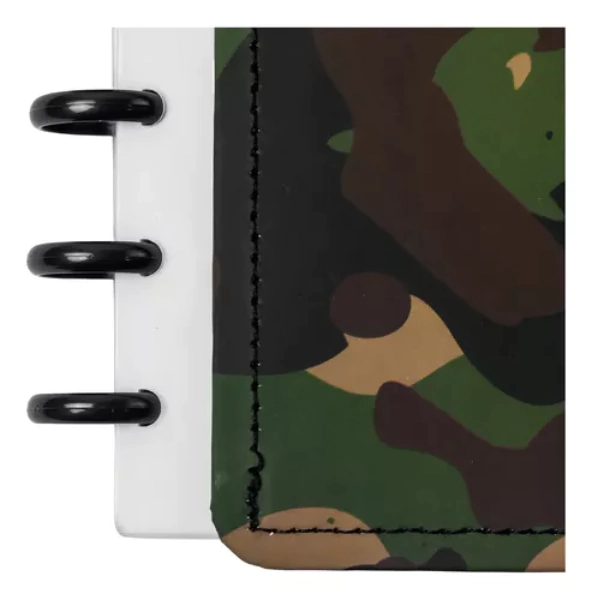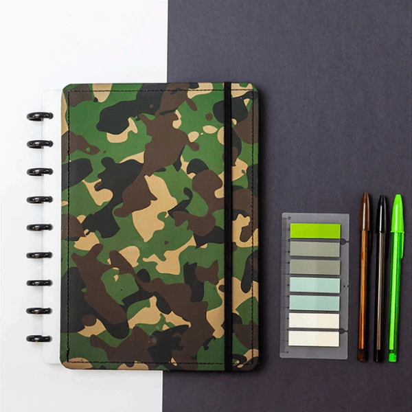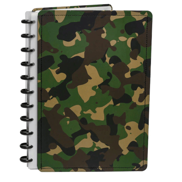 Combinar o seu caderno Camuflado com outros acessórios é fácil, a estampa simples se adapta a qualquer outra cor, além de transmitir uma imagem de força e praticidade, ideal para usar em situações acadêmicas ou profissionais.