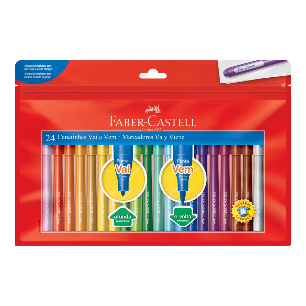 As canetinhas hidrográficas Faber-Castell estimulam a criatividade das crianças com a formulação exclusiva de corantes de alta qualidade com cores mais vivas. As canetinhas tem ponta média com a tecnologia exclusiva da ponta Vai e Vem: sistema de amortecimento contra impactos, garantindo maior resistência e durabilidade. A tinta é lavável e o produto é atóxico.