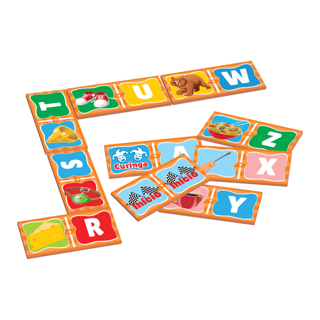 No Dominó Alfabeto as peças são divididas por uma letra e um desenho. O objetivo é relacionar o lado da letra com um desenho que tenha a mesma letra na inicial do nome.