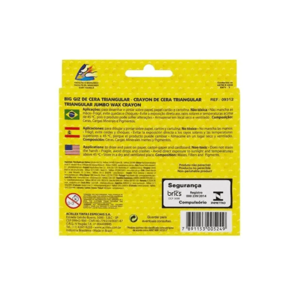 Você quer deixar a criatividade dos pequenos ainda mais solta? Conheça o Giz de Cera 12 Cores Big Triangular da Acrilex! Com suas cores vibrantes e formato triangular, é perfeito para as mãozinhas explorarem e se divertirem. Ideal para crianças a partir de 3 anos, cada giz é feito com material não tóxico, proporcionando segurança na hora da brincadeira. Não fique de fora dessa! Garanta já o seu e transforme o momento de desenhar em pura diversão!