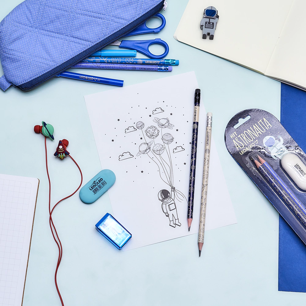 Kit lápis HB personalizado com tema de astronauta. Embalagem em blister que contém 2 Lápis grafite HB, formato redondo, com 1 Apontador e 1 borracha.