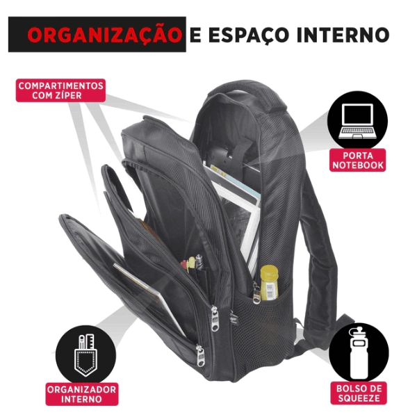 Confeccionada em Poliéster, a mochila Rabat, protege seu notebook e se adapta a qualquer situação do seu dia a dia. Possui, alça de mão, alça de costa acolchoada e compartimentos com fechamento em zíper, que facilitam na organização de seus objetos. Na parte interna amplo espaço, bolsos organizadores funcionais e compartimento para Notebook.